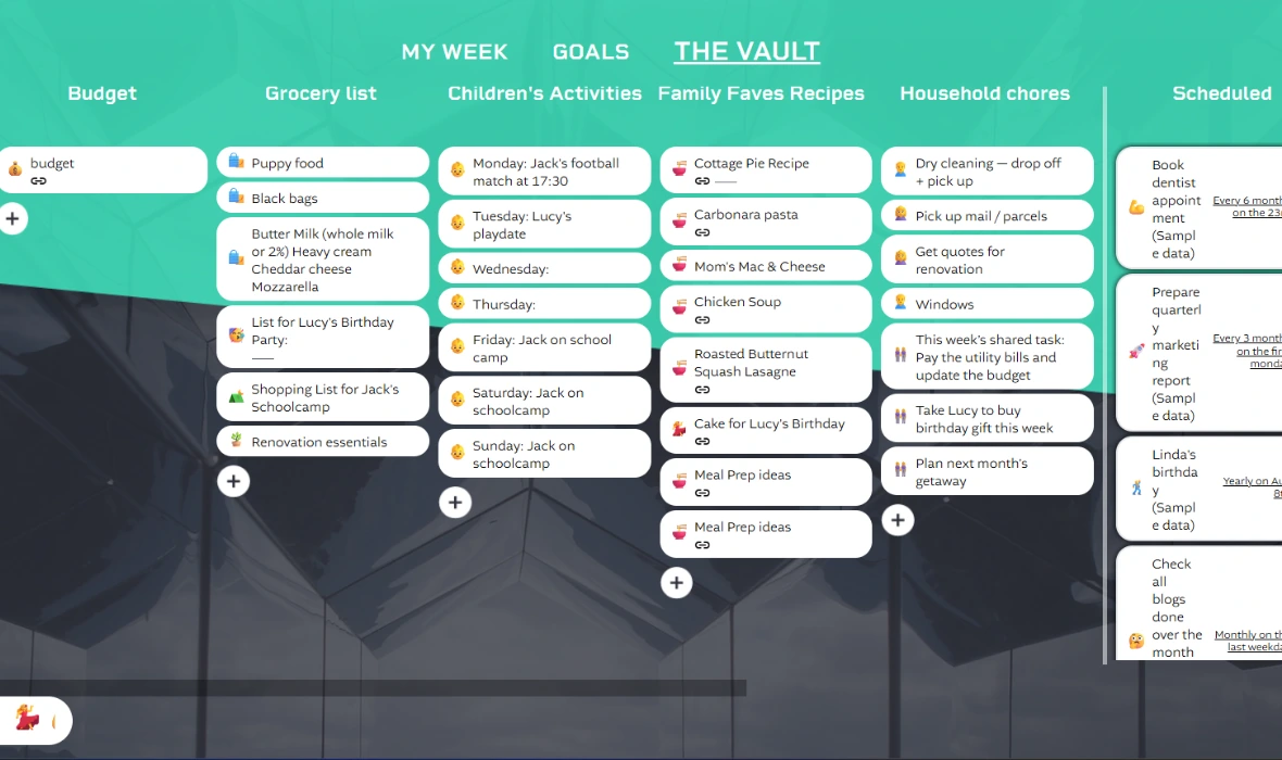 Beyond your weekly templates, Zendays offers a shared Vault, a space for storing ideas, notes, and lists. Save recipes, track chores, or keep grocery lists you’ll both actually use.